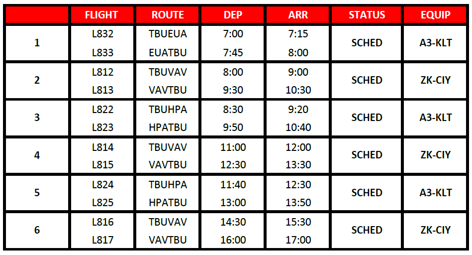 The flight schedules published by Lulutai are for informational purposes only. This schedule is subject to change without prior notice. While Lulutai strives to maintain the accuracy of the schedule and to provide timely updates to our passengers, operational factors such as weather conditions, air traffic control restrictions, aircraft maintenance, and other unforeseen circumstances may necessitate disruptions, changes, delays, or cancellations of scheduled flights. Lulutai reserves the right to amend, reschedule, or cancel any flight without liability for any resulting inconvenience or cost incurred by passengers. In such instances, we will endeavor to notify affected passengers at the earliest opportunity and provide suitable alternatives, including rebooking on the next available flight or refund options, in accordance with our policies. By booking with Lulutai, passengers acknowledge and accept these conditions.